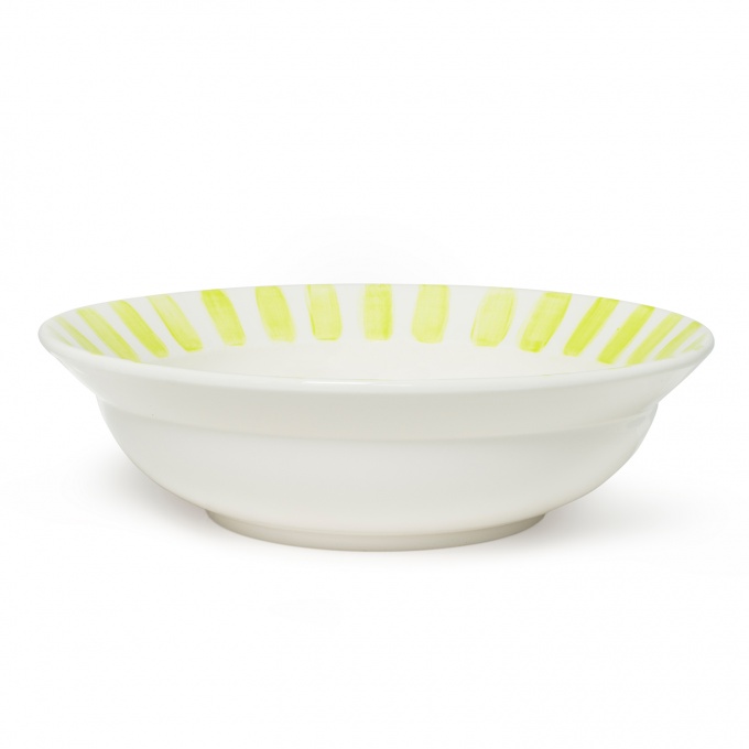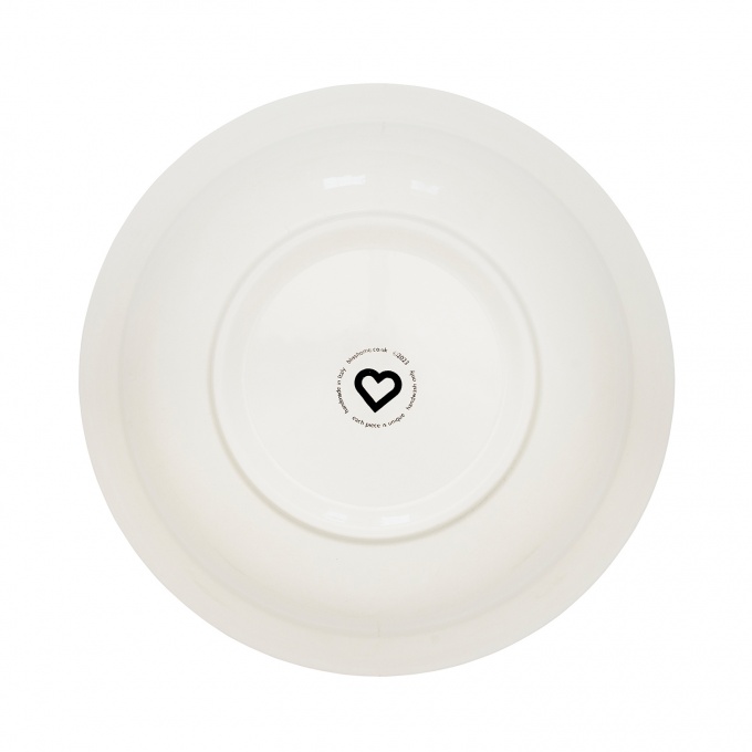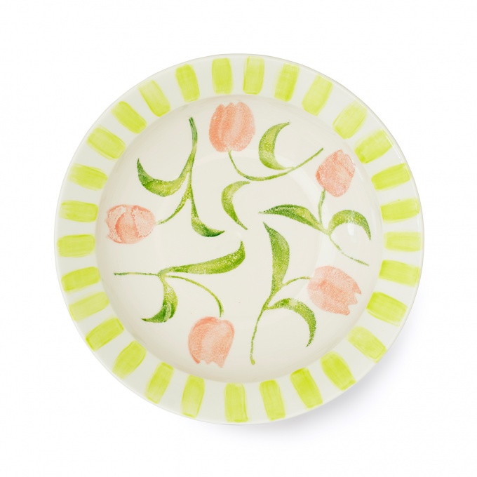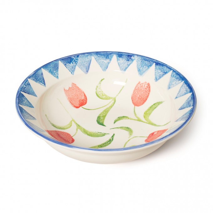 This deep serving bowl combines practicality with striking visual appeal. A lively swirl of red tulips anchors the design, encircled by a hand-sponged blue and white triangle border. Whether you're serving pasta, salad, or displaying it as a decorative piece, this bowl is a testament to BlissHome’s distinctive blend of modern design and Italian craftsmanship.
