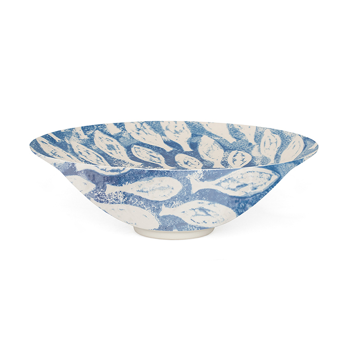 This ceramic salad bowl is embellished with a blue shoal of fish. The decoration has been applied using simple hand-sponging techniques. Each piece is handmade in Italy.